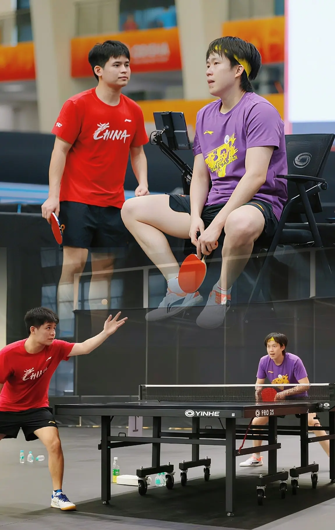 在昨天的两次训练中,国乒都安排了最强战力、男女世界前二——双头和海产,进行了合练。